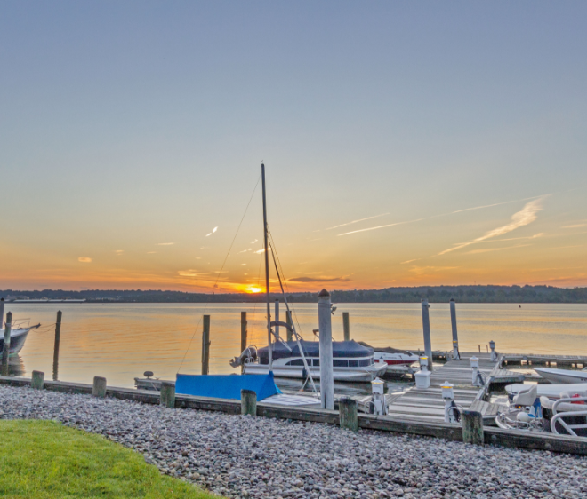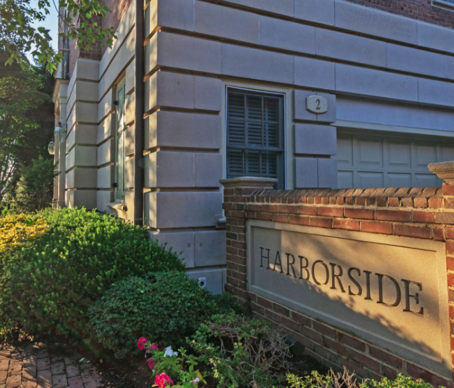 With its own private marina, the luxury 63-unit townhouse development is surrounded by more than four acres of parkland. Harborside homes range from two to five stories, with a high level of detail built into the Federal and Georgian-style townhouses completed in 1996. Some homes have elevators.